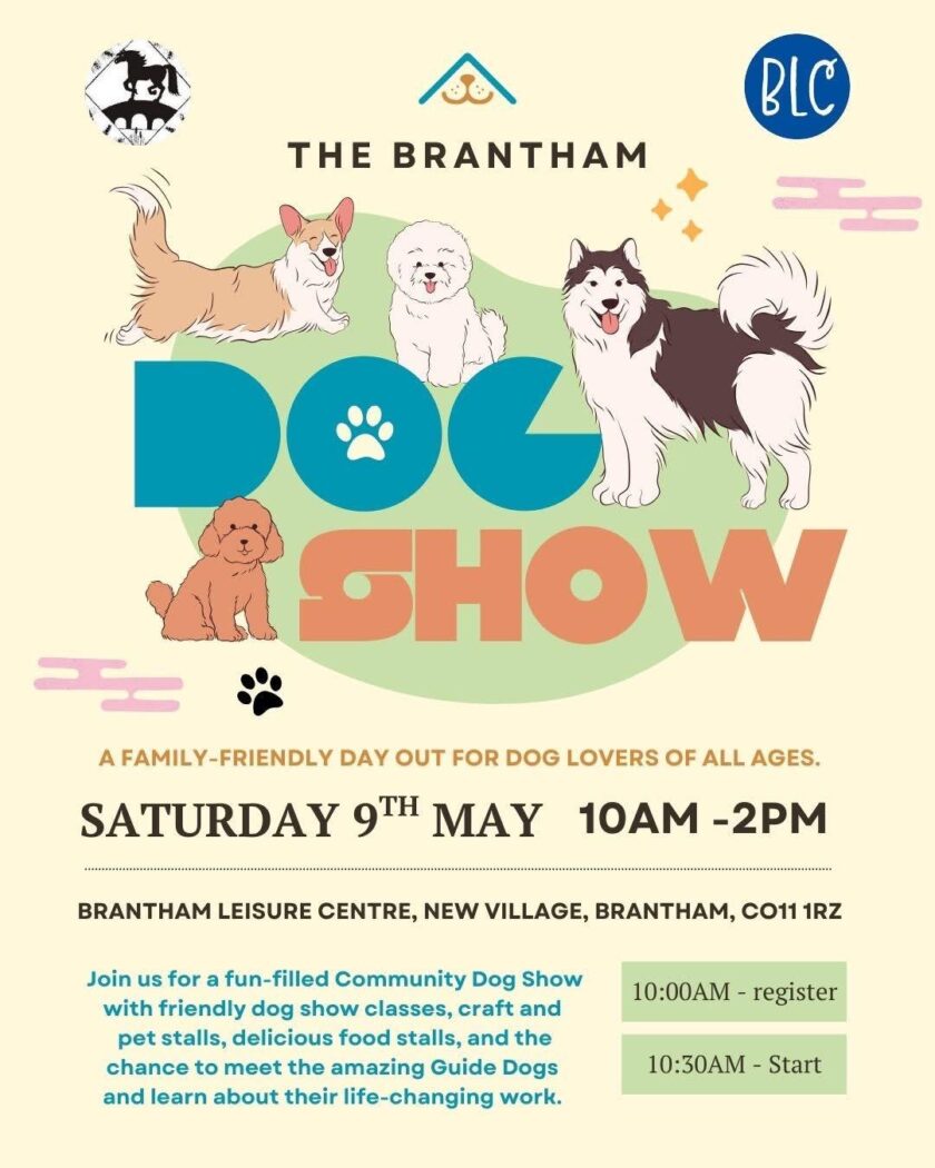 Brantham Leisure Centre New Village, Brantham,, Manningtree, Essex,, EssexThe Brantham Dog Show Saturday 9th May 10am – 2pm Brantham Leisure Centre, New Village, Brantham, CO11 1RZ Bring the whole family (and the dog!) for a pawsome day out at our Community Dog Show Enjoy a fun-filled event with: Friendly dog show classes Craft & pet stalls Delicious food stalls Meet the amazing Guide … Continue reading THE BRANTHAM DOG SHOW